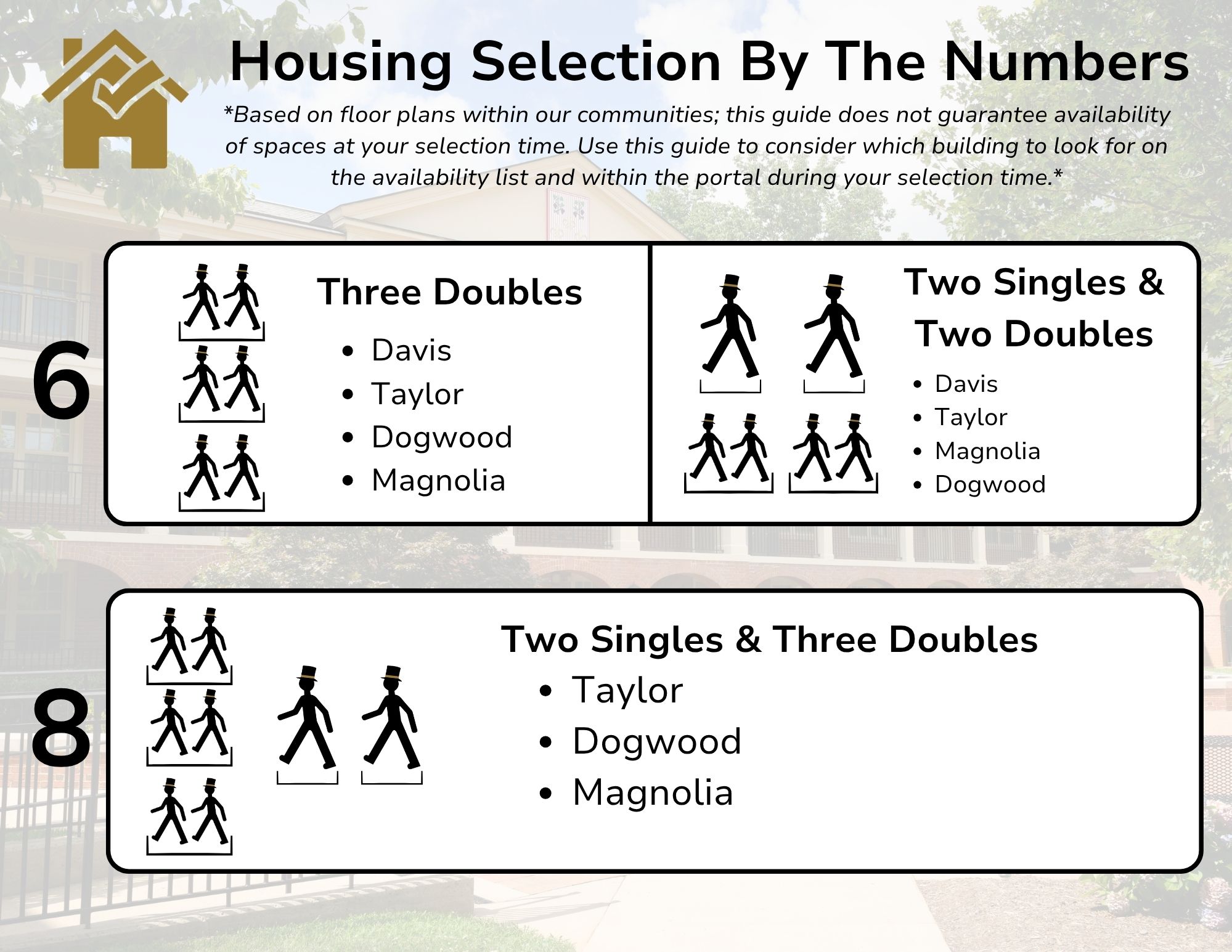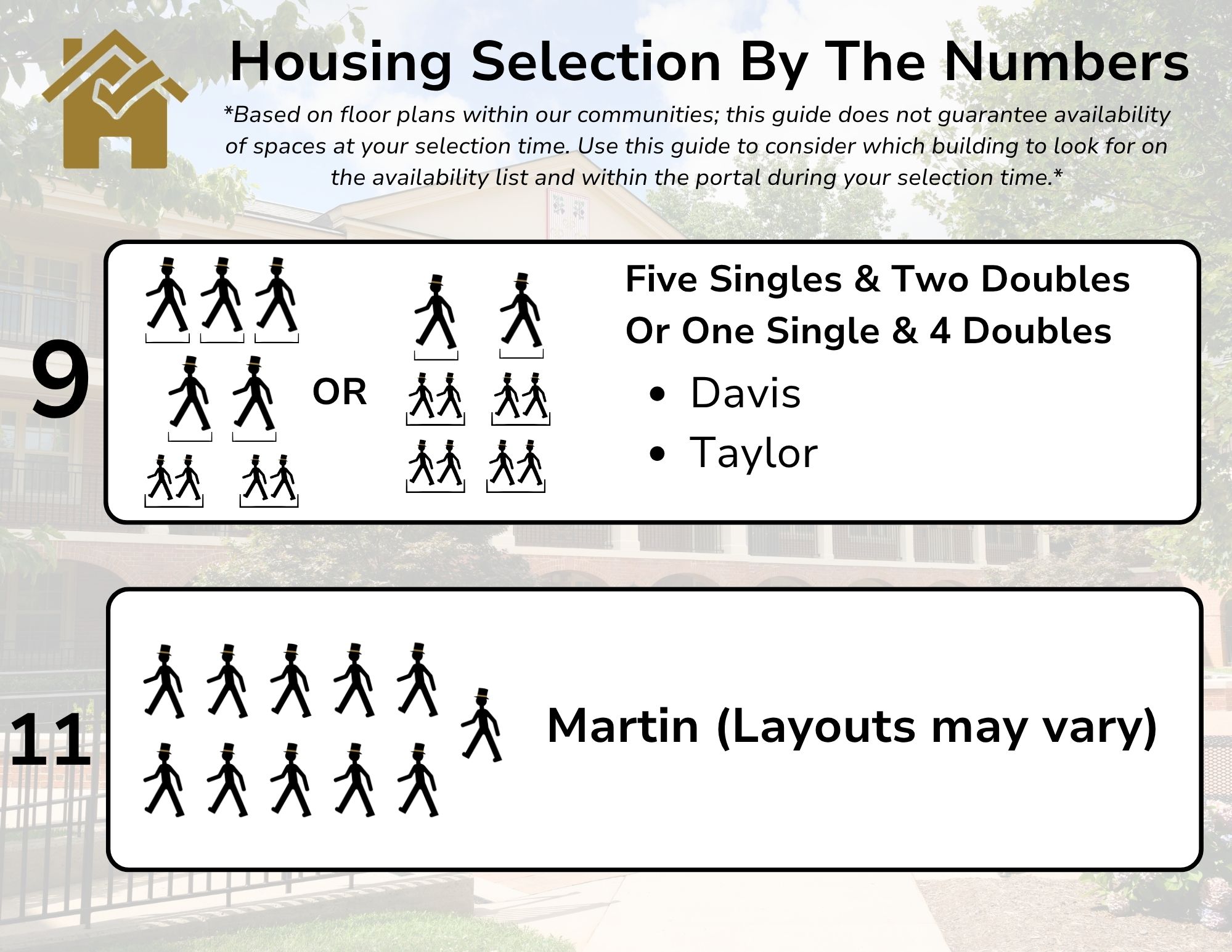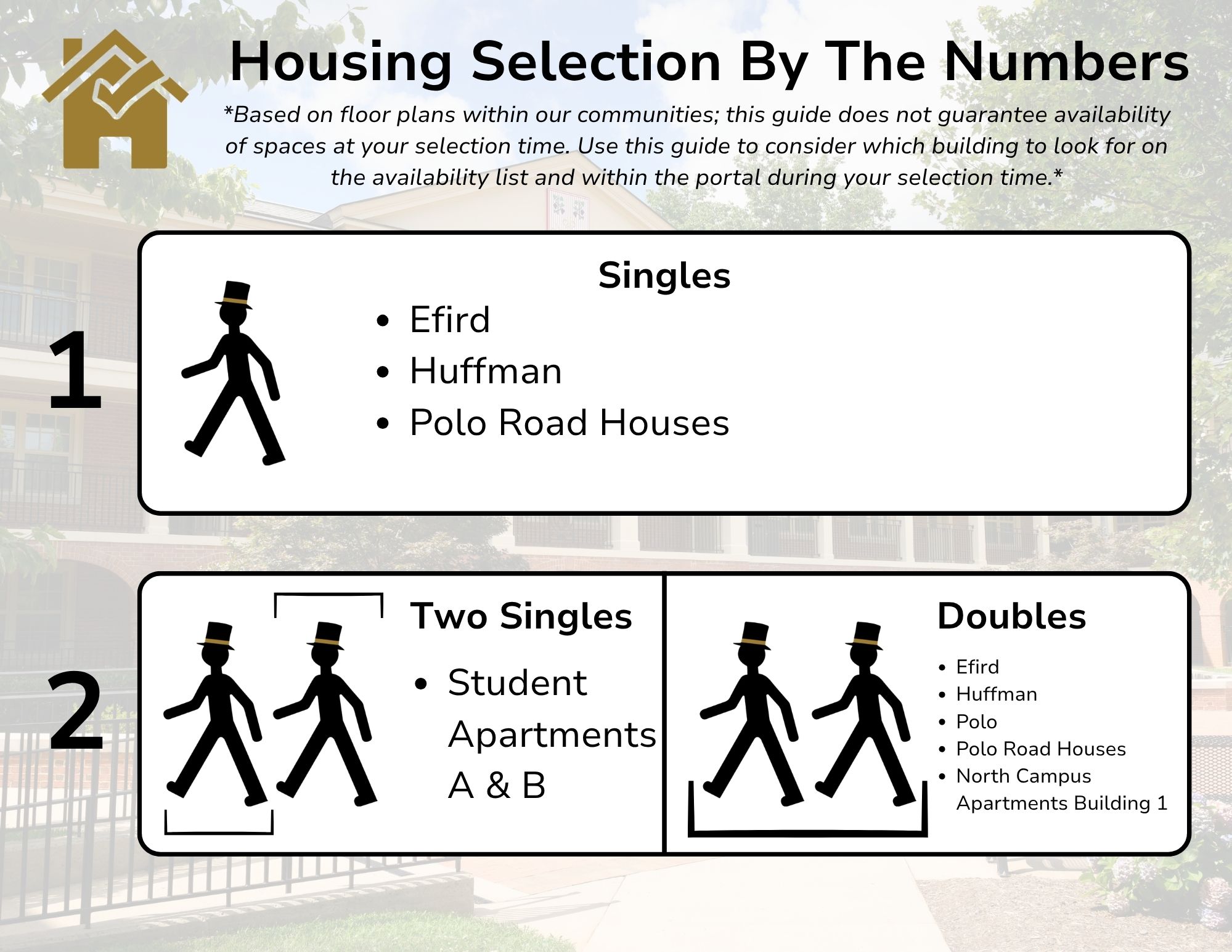 We encourage attending a Housing Selection Information Session to learn more about the process and visit Find Your Way Home for detailed step-by-step guides for completing the Housing Selection Process.
