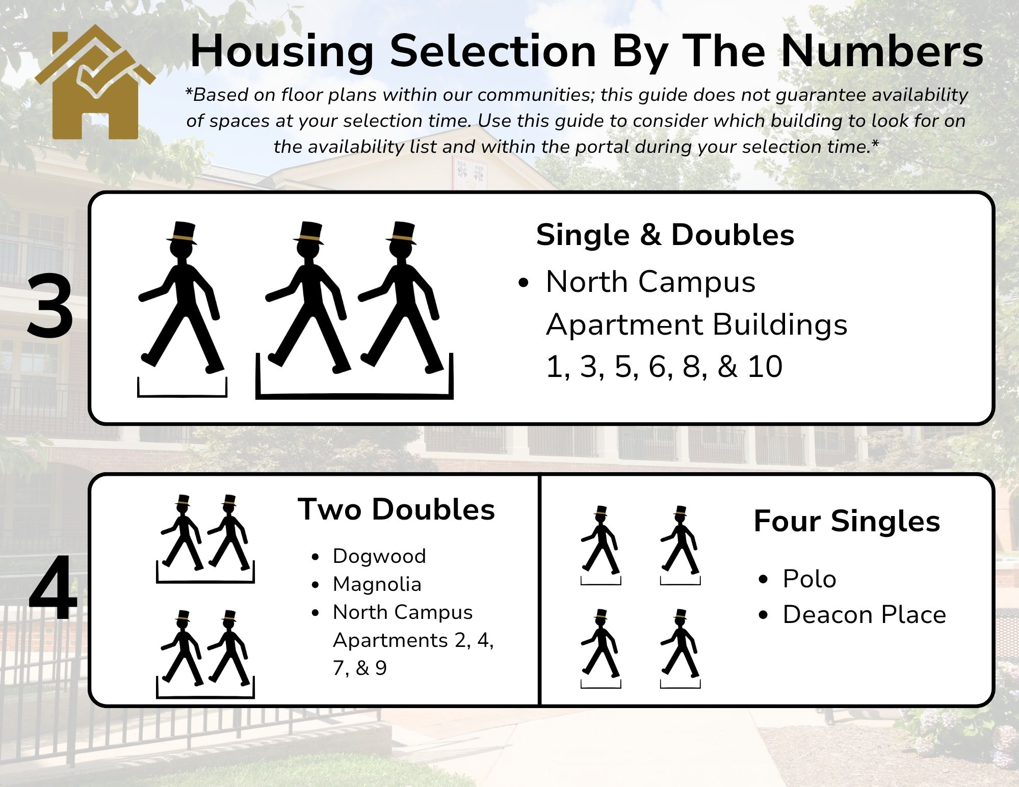 As you plan, be sure to review the important information below regarding housing for the 2026-2027 academic year, please note that housing selection will occur after Fall 2026 class registration as students must be registered to classes in order to participate in housing selection. We encourage you to check here regularly for updates.